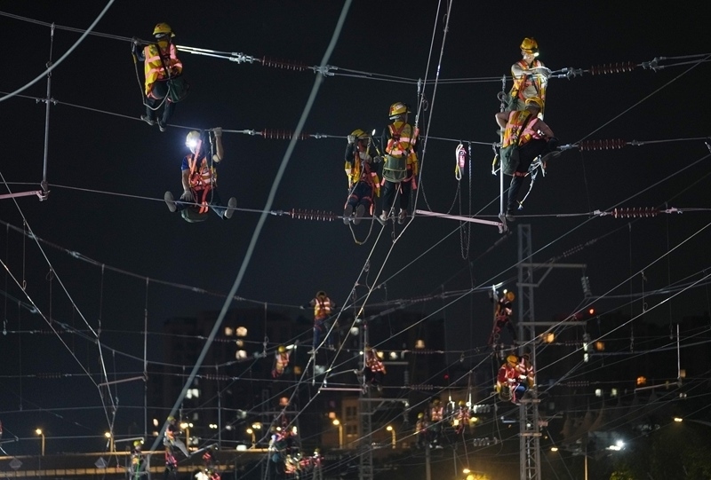 6月19日,在成渝中線高鐵成都站南北站場交替施工現(xiàn)場,中國中鐵電氣化局的施工人員在南站場進行接觸網(wǎng)施工作業(yè)。