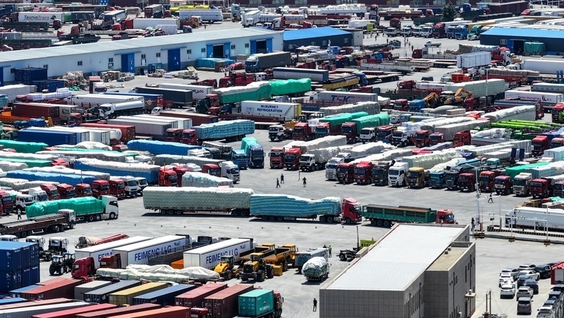6月22日拍攝的內(nèi)蒙古二連浩特公路口岸(無人機(jī)全景照片)。