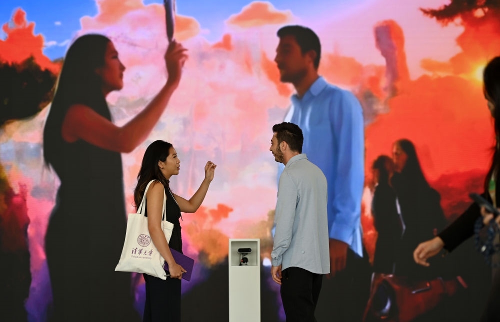6月25日,嘉賓在第十六屆夏季達(dá)沃斯論壇文化之夜上和人形機(jī)器人互動(dòng)。新華社記者 李然 攝