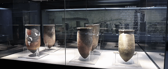 “這是一件出土于安徽蒙城新石器時(shí)代尉遲寺遺址的大口陶尊,距今大約4800年。”講解員指著一件陶器展品,“它的特別之處是器物上有著刻畫符號(hào),分別是‘日’‘月’‘山’形。抽象的表達(dá)和組合,已經(jīng)超越了簡(jiǎn)單的圖畫,使我們看到了漢字的雛形。”