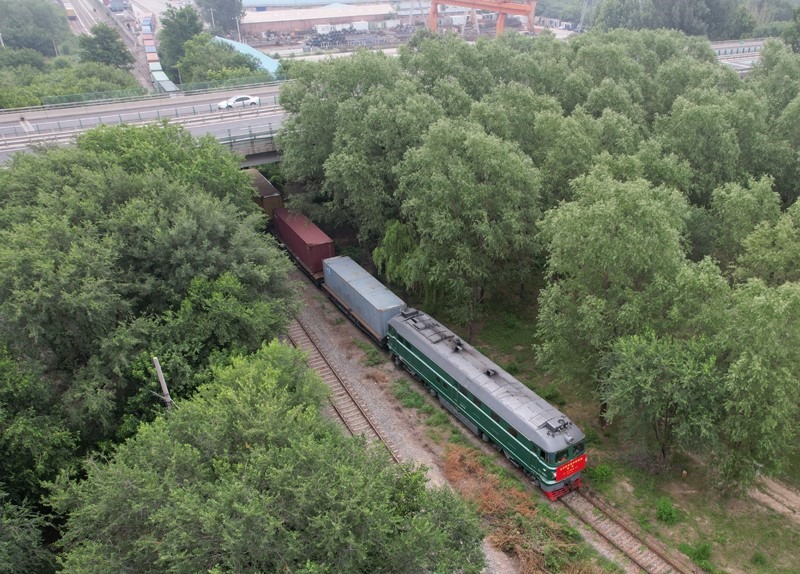 6月30日,北京至阿塞拜疆巴庫(kù)的跨里海中歐班列停靠在位于北京市房山區(qū)的北京國(guó)際陸港等待發(fā)車(無(wú)人機(jī)照片)。