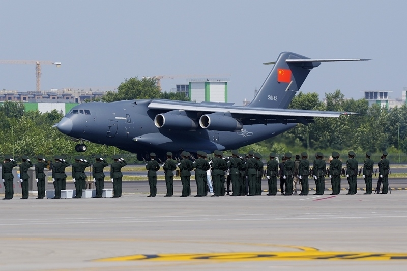 9月12日,第十二批在韓中國(guó)人民志愿軍烈士遺骸回國(guó)。這是接運(yùn)烈士遺骸回國(guó)的運(yùn)-20飛機(jī)降落在沈陽(yáng)桃仙國(guó)際機(jī)場(chǎng)。