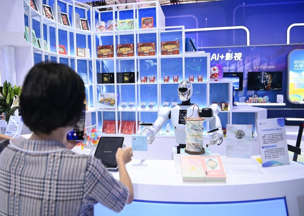 9月11日,在服貿(mào)會文旅服務專題展區(qū),參觀者在“海淀有禮文創(chuàng)機器人快閃店”與機器人互動。新華社記者 肖瀟 攝