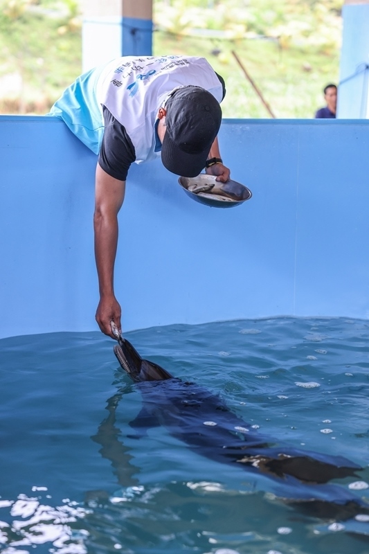9月14日,在位于海南陵水的救助中心,救助人員給海豚“萬(wàn)萬(wàn)”喂食。