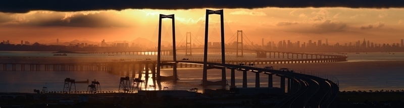 9月14日拍攝的沐浴在晨曦之中的深中通道與遠處的深圳市區(qū)。