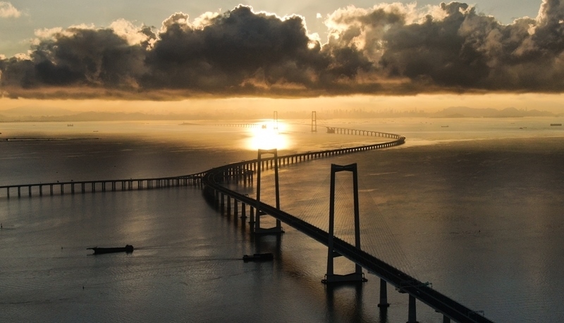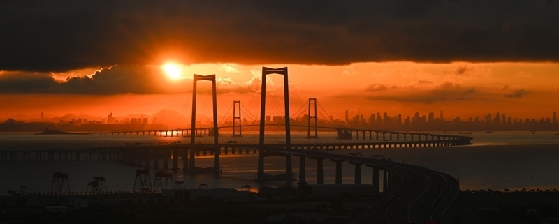 珠江口伶仃洋上,深中通道沐浴在晨曦之中,長虹臥波、美不勝收。