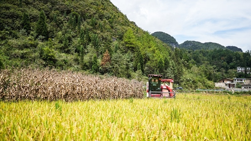 工作人員駕駛農用機械在長順縣長寨街道中塘村收割水稻(9月17日攝)。