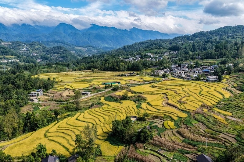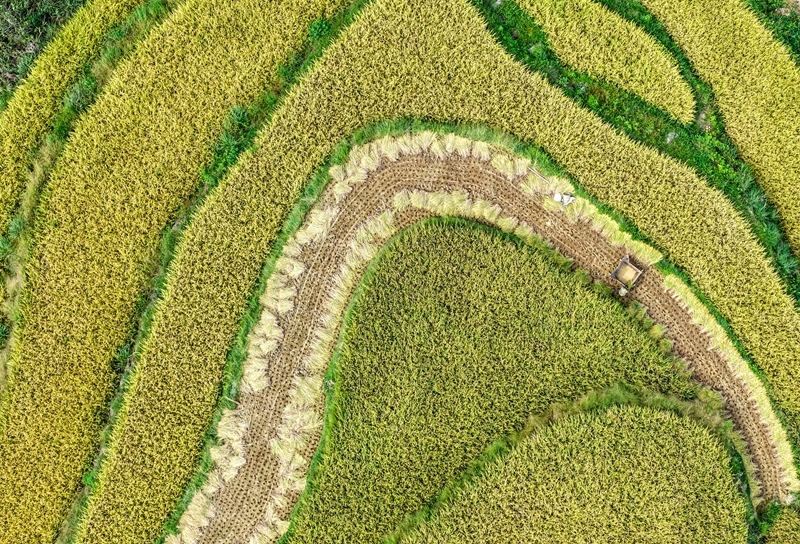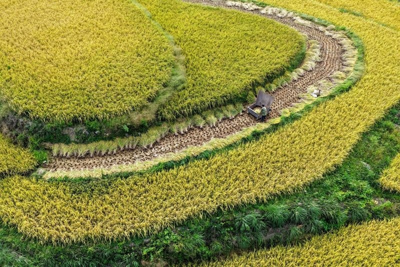 地處武陵山區(qū)腹地的重慶市黔江區(qū)五里鎮(zhèn)水稻種植面積5300畝,是武陵山地區(qū)糧食主要產(chǎn)區(qū)之一。秋收時節(jié),金黃色的水稻鋪滿山坡,稻農(nóng)們利用晴好天氣搶收稻谷,呈現(xiàn)出一派美麗的豐收畫卷。