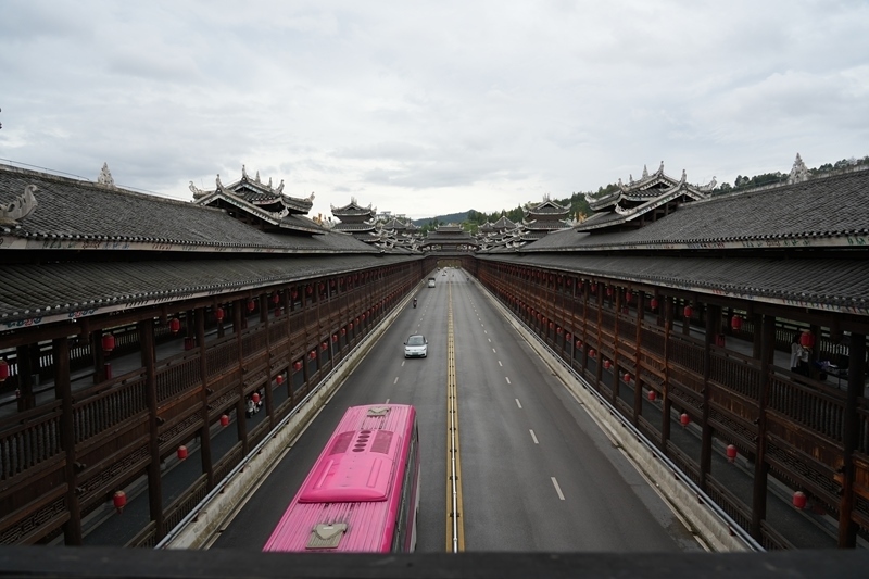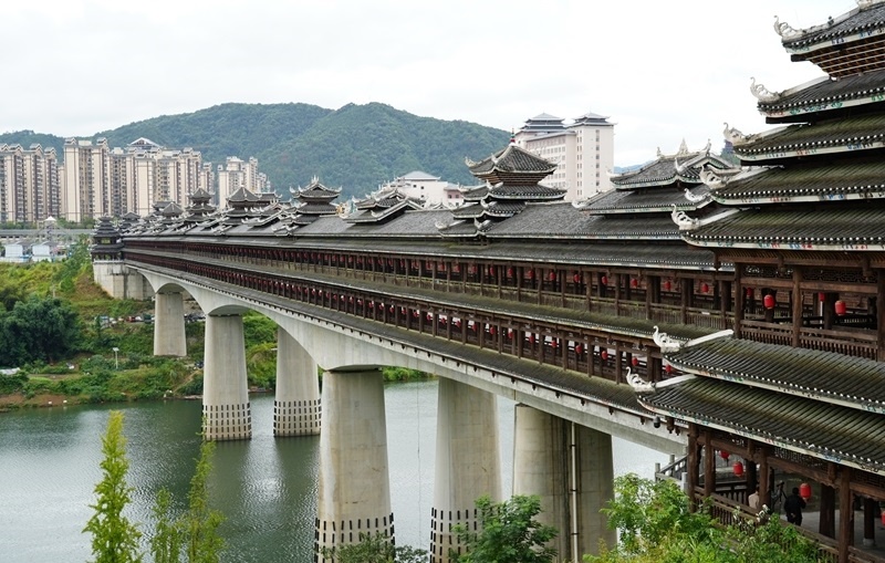 這是9月25日拍攝的三江侗族自治縣的宜陽(yáng)風(fēng)雨橋。該橋橫跨潯江之上,全長(zhǎng)399.6米,寬28米。橋面設(shè)雙向四車道,橋上共兩層,二層建有跨橋人行通道。
