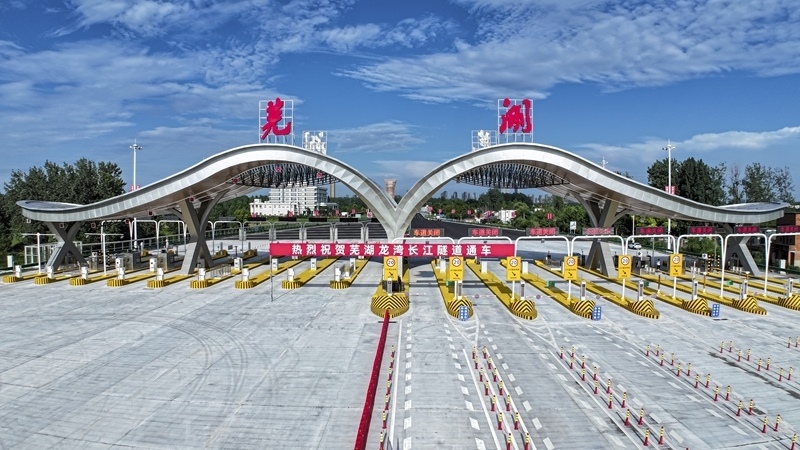 7月1日,車輛通過蕪湖龍灣長(zhǎng)江隧道收費(fèi)站(無人機(jī)照片)。