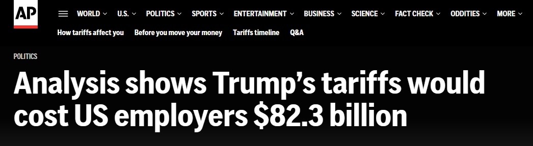 4月份,特朗普政府宣布所謂“對(duì)等關(guān)稅”政策后,金融市場(chǎng)出現(xiàn)恐慌。隨后,又設(shè)定了90天談判期,期間多數(shù)進(jìn)口商品面臨10%基準(zhǔn)稅率。報(bào)道稱,若4月2日的初始關(guān)稅維持不變,研究中所涉及的企業(yè)將承受更為高昂的1876億美元的額外成本。若按照現(xiàn)行稅率,823億美元成本平均到每位員工身上就是2080美元,相當(dāng)于年均薪資的3.1%。這一平均值涵蓋了無進(jìn)口業(yè)務(wù)與有進(jìn)口業(yè)務(wù)企業(yè)。