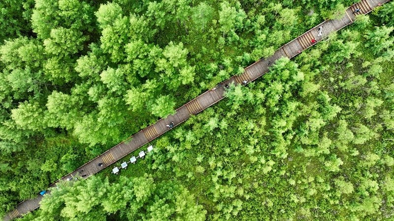 7月5日,游客在內(nèi)蒙古阿爾山國(guó)家森林公園游玩(無(wú)人機(jī)照片)。