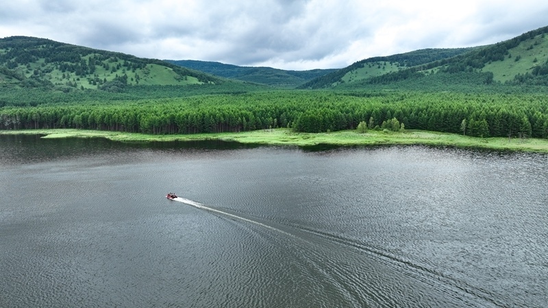 7月5日,游客在內(nèi)蒙古阿爾山國(guó)家森林公園烏蘇浪子湖景區(qū)乘船游玩(無(wú)人機(jī)照片)。