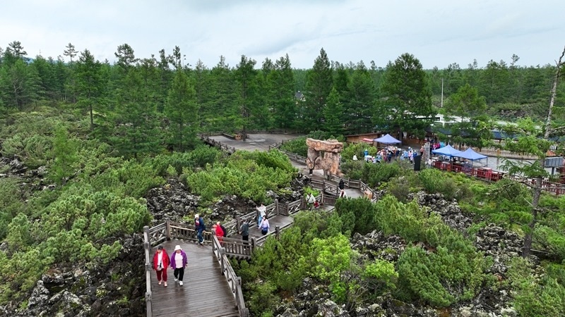 7月5日,游客在內(nèi)蒙古阿爾山國(guó)家森林公園石塘林景區(qū)游玩(無(wú)人機(jī)照片)。