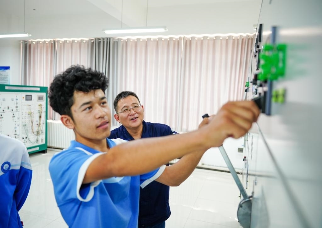 2025年6月27日,在新疆和田技師學(xué)院,北京援疆教師李東軍(右)指導(dǎo)學(xué)生操作高壓變配電設(shè)備。新華社記者 徐宏巖 攝