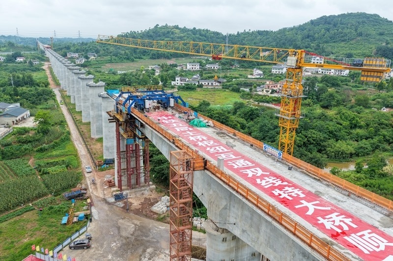 這是7月8日拍攝的成渝中線高鐵土橋樞紐互通雙線特大橋建設(shè)現(xiàn)場(無人機(jī)照片)。