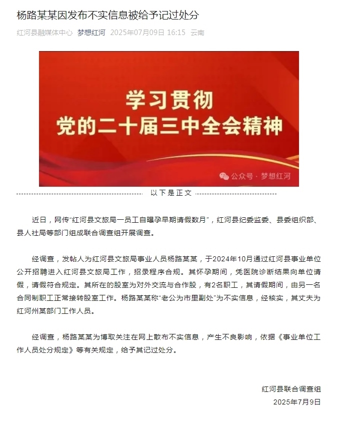 經(jīng)調(diào)查,發(fā)帖人為紅河縣文旅局事業(yè)人員楊路某某,于2024年10月通過紅河縣事業(yè)單位公開招聘進入紅河縣文旅局工作,招錄程序合規(guī)。其懷孕期間,憑醫(yī)院診斷結(jié)果向單位請假,請假符合規(guī)定。其所在的股室為對外交流與合作股,有2名職工,其請假期間,由另一名合同制職工正常接轉(zhuǎn)股室工作。楊路某某稱“老公為市里副處”為不實信息,經(jīng)核實,其丈夫為紅河州某部門工作人員。
