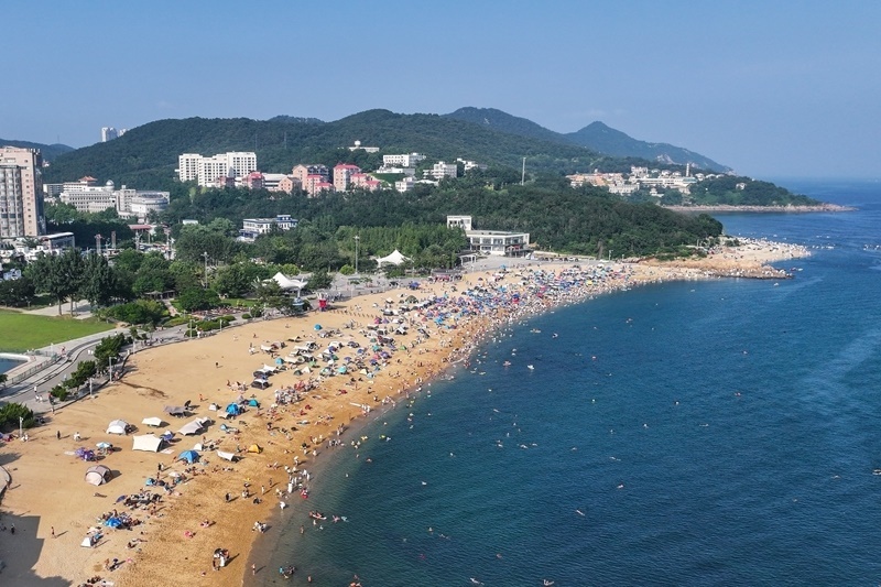7月10日拍攝的大連傅家莊公園海濱沙灘(無人機(jī)照片)。