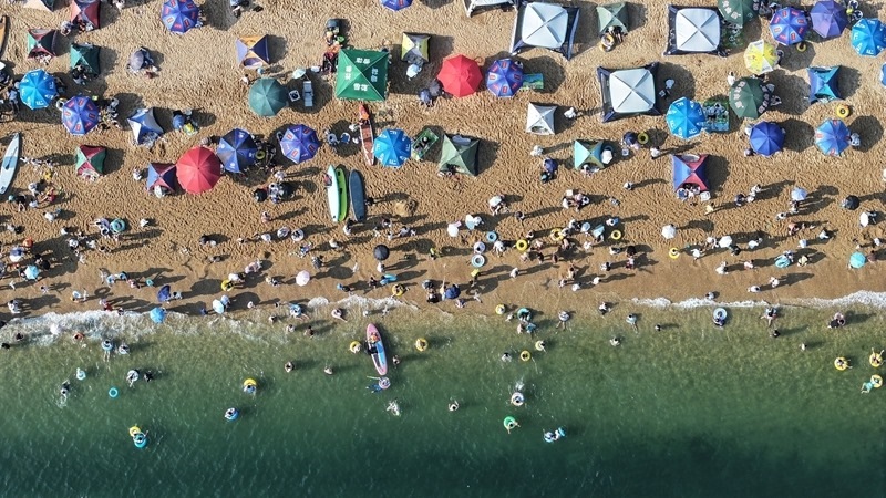 7月10日,游客在大連傅家莊公園海濱沙灘戲水消暑(無人機(jī)照片)。