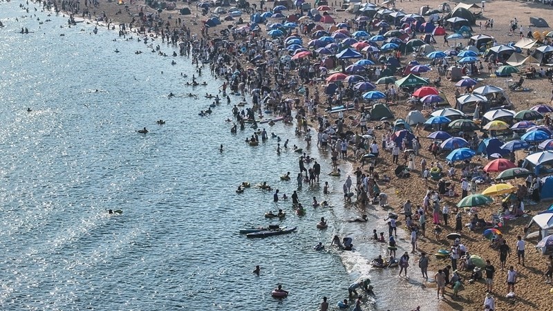 近日,遼寧省大連市持續(xù)高溫天氣,大連傅家莊公園海濱沙灘迎來大量游客,人們在海濱沙灘戲水消暑。