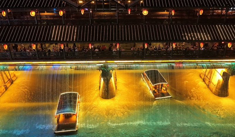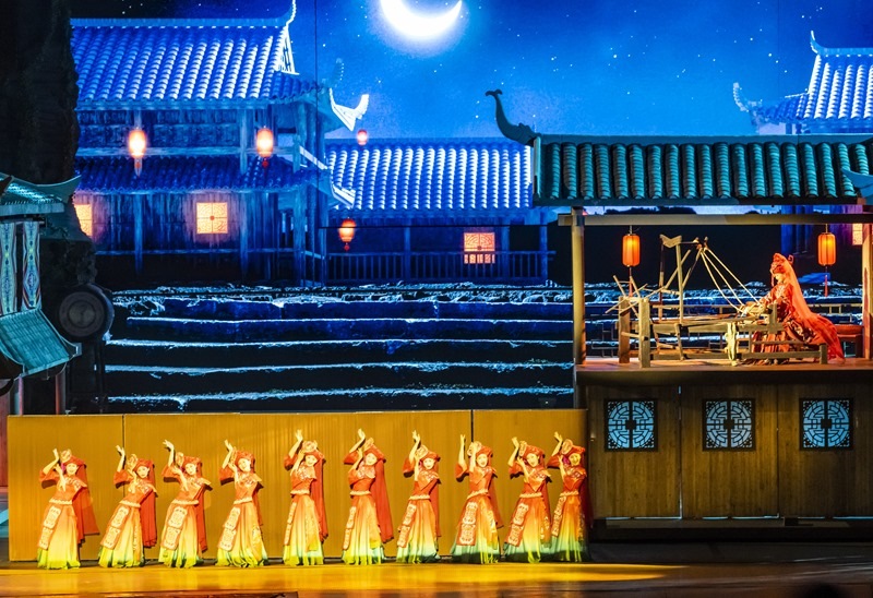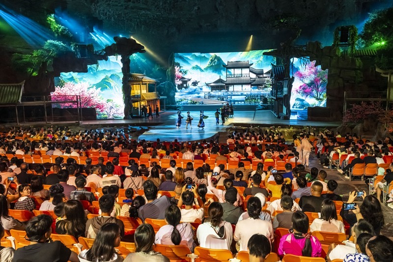 7月10日,游客在利川市騰龍洞的洞穴內觀看實景劇《夷水麗川》。