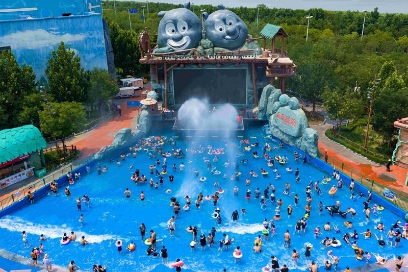 7月12日,人們?cè)谔旖驗(yàn)I海新區(qū)方特水上樂(lè)園戲水納涼。