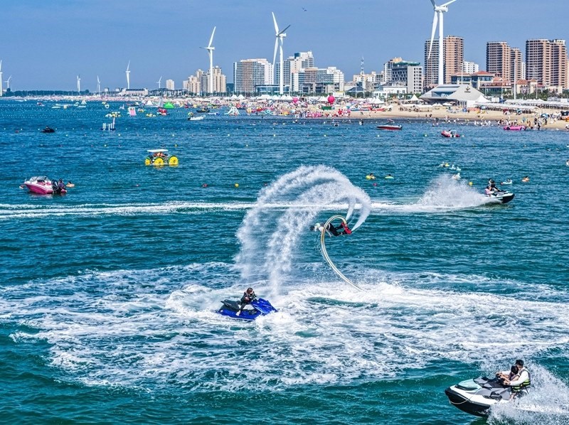 7月12日,在山東省榮成市那香海景區(qū),游客享受海上旅游項(xiàng)目帶來(lái)的清涼與歡樂(lè)(無(wú)人機(jī)照片)。