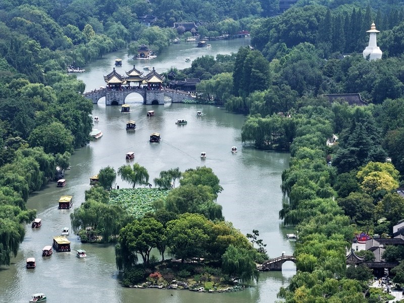 7月13日,游客乘坐游船在江蘇揚(yáng)州瘦西湖風(fēng)景區(qū)游覽(無(wú)人機(jī)照片)。