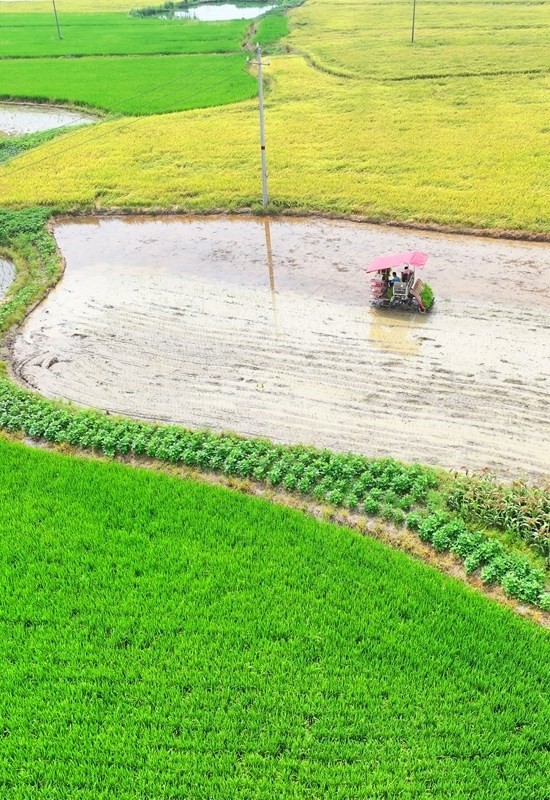 7月13日,湖南省衡陽市衡東縣霞流鎮(zhèn)農(nóng)民駕駛農(nóng)機進行晚稻插秧工作(無人機照片)。