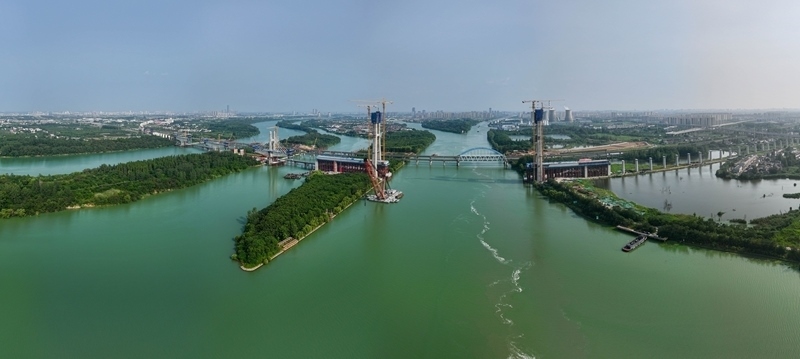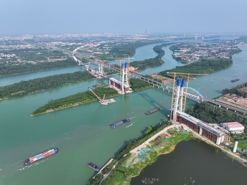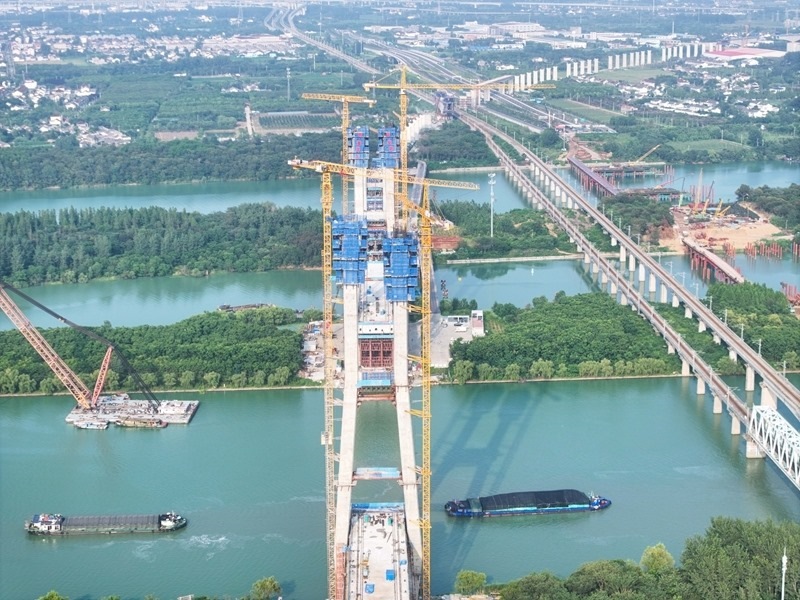 這是滬渝蓉高鐵跨京杭運(yùn)河斜拉橋施工現(xiàn)場(chǎng)(7月13日攝,無人機(jī)照片)。