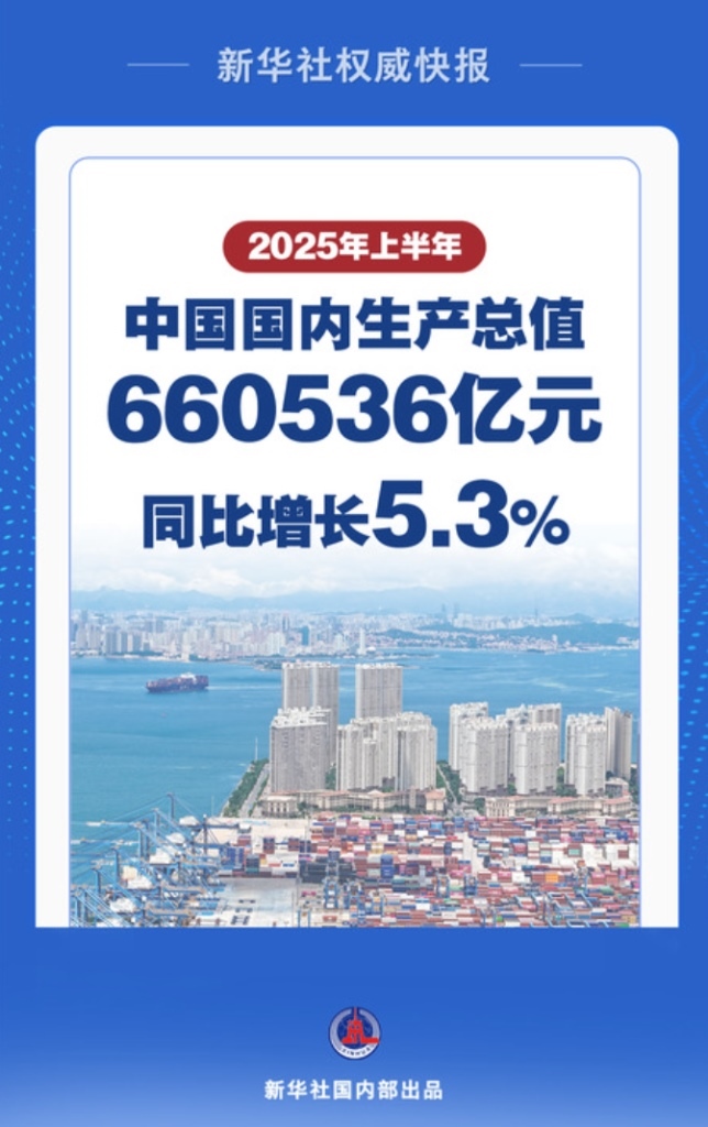 7月15日,國家統(tǒng)計(jì)局發(fā)布數(shù)據(jù)顯示,上半年,中國國內(nèi)生產(chǎn)總值(GDP)660536億元,按不變價(jià)格計(jì)算,同比增長5.3%。