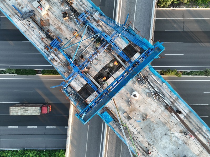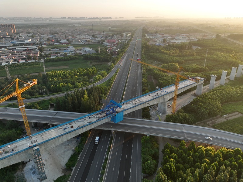 7月18日拍攝的雄忻高鐵保定東特大橋跨京港澳高速連續(xù)梁中跨施工現(xiàn)場(chǎng)(無人機(jī)照片)。