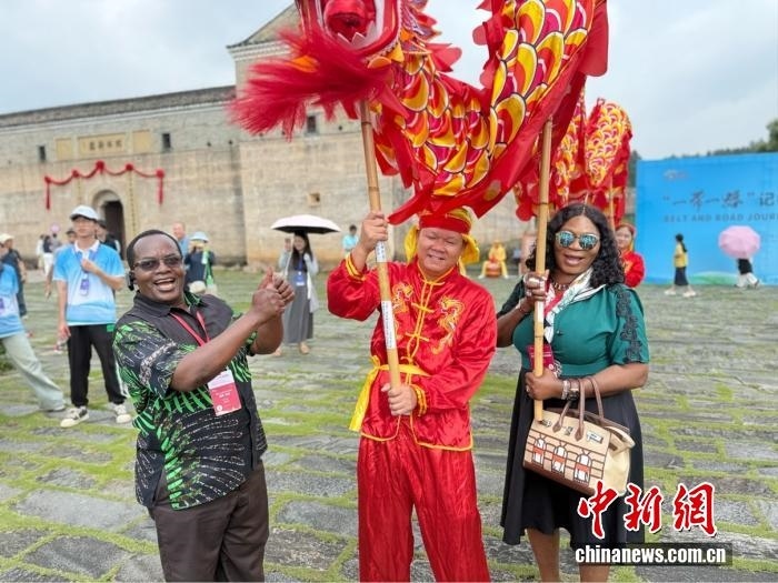 中新網(wǎng)7月21日電(記者 黃方) 鼓聲“咚咚咚”在江西贛州龍南市關(guān)西新圍響起,非洲記者大會秘書長威廉·奧洛首次嘗試舞龍。他興奮地?fù)u動著龍頭,跟隨節(jié)奏躍動,忍不住連聲贊嘆:“這太有節(jié)奏感了!”