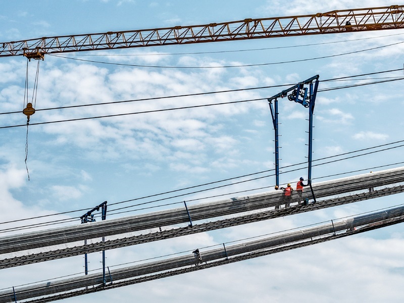 7月30日,在重慶黃桷沱長(zhǎng)江大橋建設(shè)現(xiàn)場(chǎng),工人在施工作業(yè)(無(wú)人機(jī)照片)。