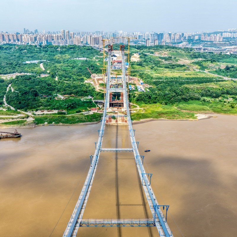 當(dāng)日,由重慶城投集團(tuán)投資、城投建設(shè)公司組織建設(shè)、中國(guó)鐵建大橋局承建的黃桷沱長(zhǎng)江大橋順利完成主纜架設(shè)工作,標(biāo)志著大橋建設(shè)即將進(jìn)入鋼桁梁吊裝工序。黃桷沱長(zhǎng)江大橋全長(zhǎng)1260米,主跨765米,為單跨懸吊雙塔三跨連續(xù)鋼桁梁懸索橋,是國(guó)內(nèi)最大跨徑公軌兩用懸索橋。黃桷沱長(zhǎng)江大橋是渝長(zhǎng)高速?gòu)?fù)線連接道工程的控制性節(jié)點(diǎn)工程,建成后將成為聯(lián)系重慶主城區(qū)長(zhǎng)江南北兩岸的重要交通干道。