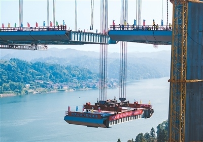 8月3日,由湖南路橋建設(shè)集團(tuán)承建的張官高速控制性工程洞庭溪沅水特大橋主橋順利合龍,為2026年全線通車奠定堅(jiān)實(shí)基礎(chǔ)。張官高速公路北起張家界市永定區(qū),南至懷化市沅陵縣官莊鎮(zhèn),是國家高速公路網(wǎng)呼和浩特—北海高速公路的重要組成部分。圖為大橋施工現(xiàn)場(chǎng),一塊鋼混結(jié)合梁在被緩緩提升。新華社記者 陳思汗攝