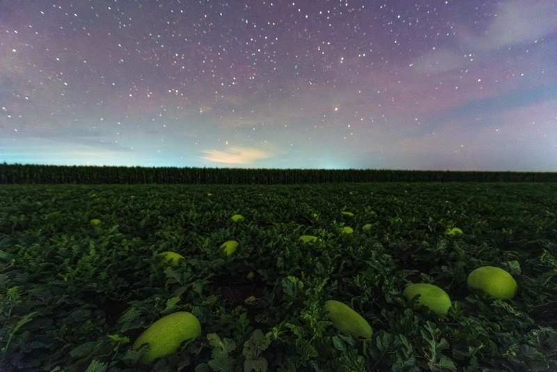 7月23日在黑龍江省佳木斯市富錦市上街基鎮(zhèn)拍攝的星空下的西瓜地。