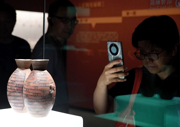 2025年6月14日,參觀者在大河村遺址博物館新館內(nèi)拍攝展品彩陶雙連壺。新華社記者 郝源 攝