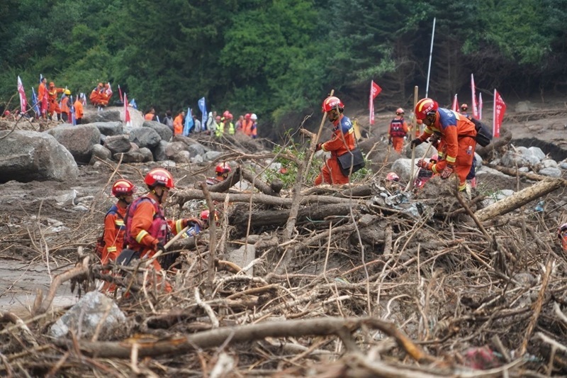 8月10日,國(guó)家綜合性消防救援隊(duì)伍救援人員在甘肅省榆中縣馬坡鄉(xiāng)馬蓮灘村、舊莊溝村和城關(guān)鎮(zhèn)興隆山村等區(qū)域持續(xù)搜救失聯(lián)人員。