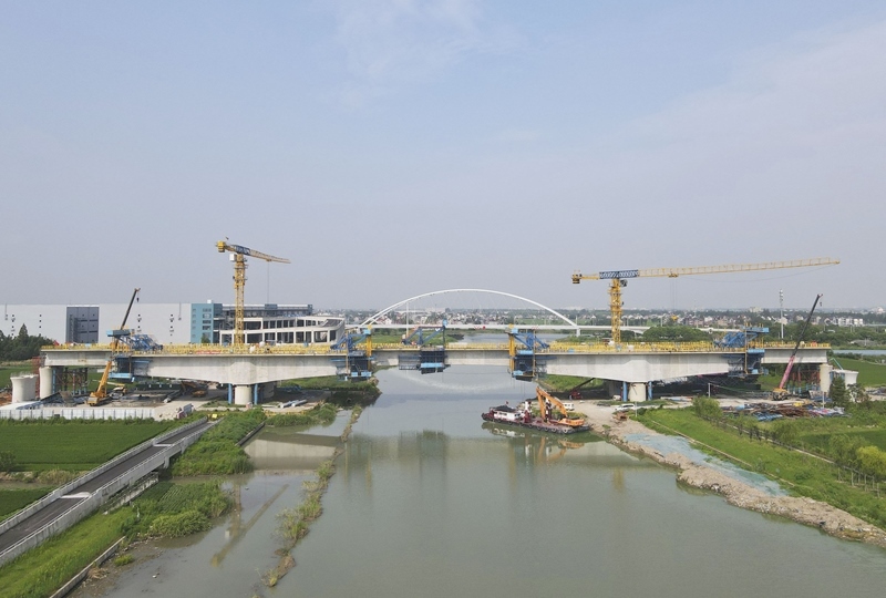 8月12日拍攝的滬寧合高鐵上海特大橋跨羅蘊河連續(xù)梁施工現(xiàn)場(無人機照片)。