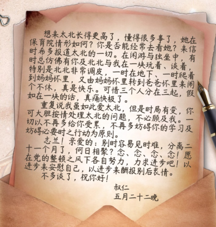 在信的最后,左權(quán)不得不忍痛交代妻子:“我雖如此愛太北,但是時(shí)局有變,你可大膽按情處理太北的問題,不必顧及我?!辈⒚銊?lì)妻子以進(jìn)步來安慰自己,以進(jìn)步來酬報(bào)別后衷情。