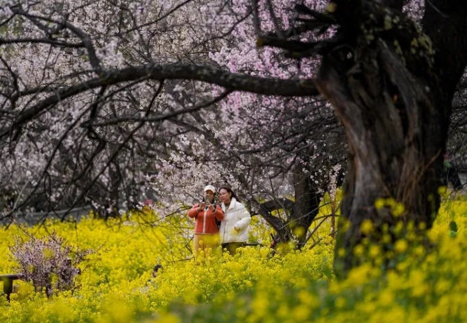 游客在西藏林芝市嘎拉村賞花(2025年4月2日攝)。新華社記者 晉美多吉 攝