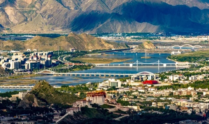 這是2025年7月30日拍攝的拉薩河風光,由近及遠分別是連心橋、柳梧大橋、和美橋和青藏鐵路拉薩河特大橋。新華社記者 姜帆 攝
