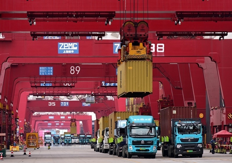8月26日,貨運卡車在山東港口青島港前灣港區(qū)碼頭運送集裝箱。
