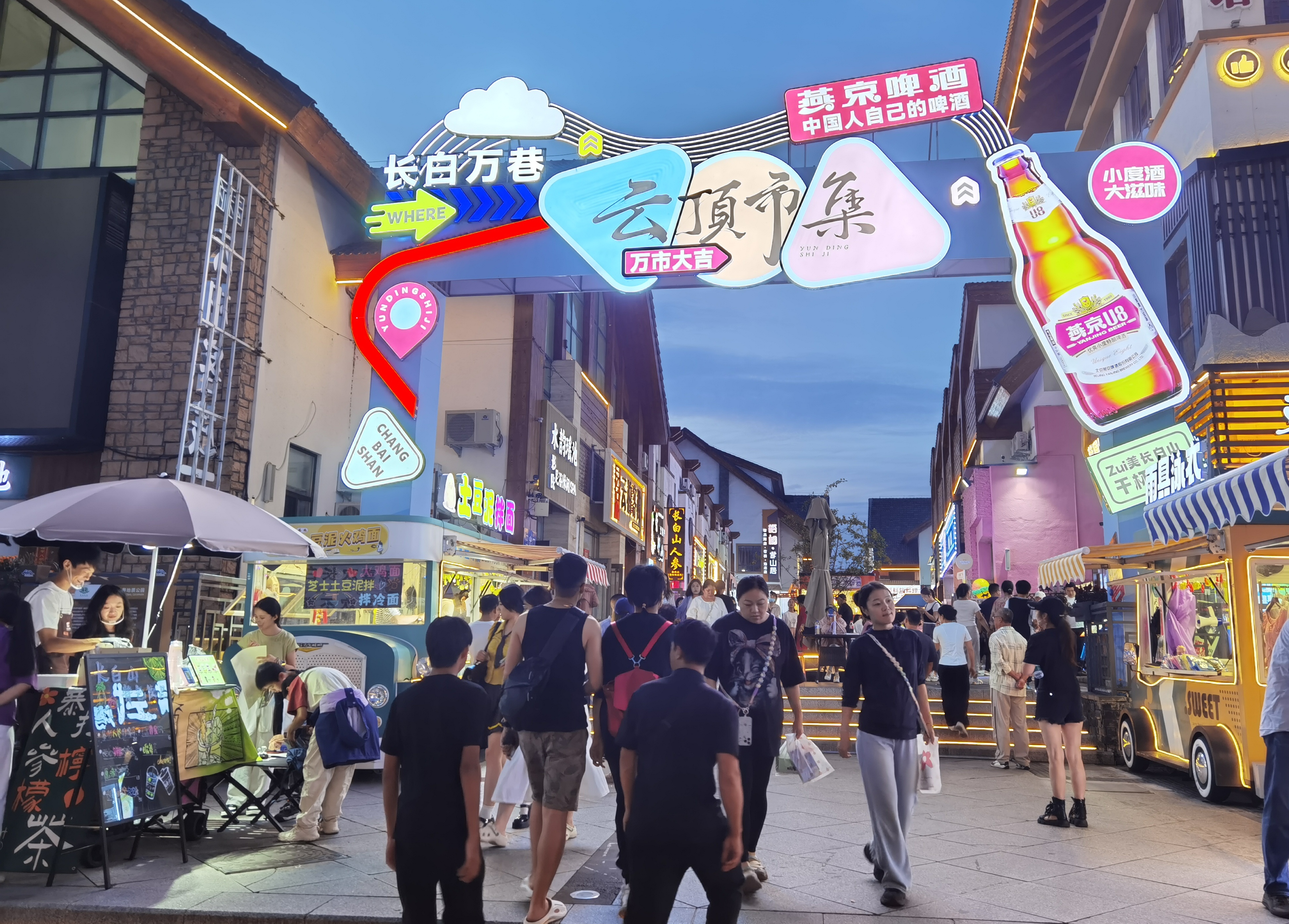 夜幕初降,云頂市集人潮涌動,樂隊彈唱與林間松風交織;雪絨花音樂生活館里,燈光璀璨,民謠悠遠;美人松愛情森林里,漫步其間的情侶與家庭,寫下屬于他們的浪漫記憶。更令人驚艷的,是今夏盛大開街的恩都里(滿語enduri意為“神靈”)休閑度假商旅社區(qū)。