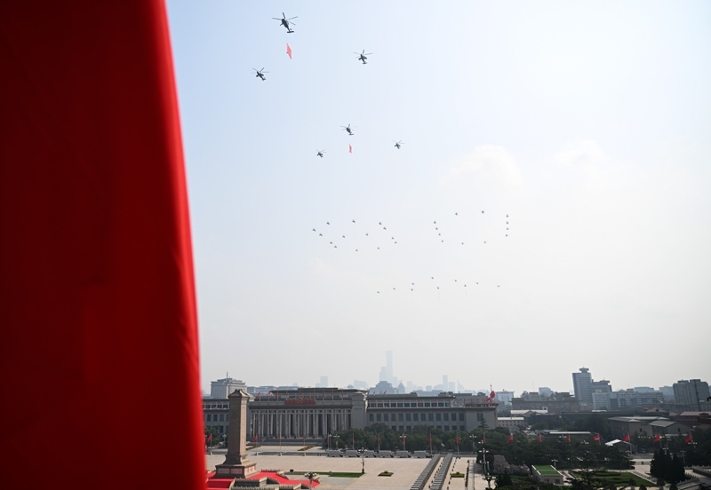 9月3日,紀(jì)念中國(guó)人民抗日戰(zhàn)爭(zhēng)暨世界反法西斯戰(zhàn)爭(zhēng)勝利80周年大會(huì)在北京隆重舉行。這是空中護(hù)旗梯隊(duì)飛過(guò)天安門(mén)廣場(chǎng)上空,26架直升機(jī)匯成巨大的“80”字樣。