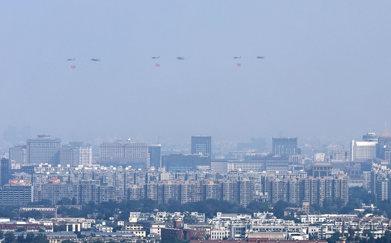 9月3日,紀(jì)念中國(guó)人民抗日戰(zhàn)爭(zhēng)暨世界反法西斯戰(zhàn)爭(zhēng)勝利80周年大會(huì)在北京隆重舉行。這是空中護(hù)旗梯隊(duì)。