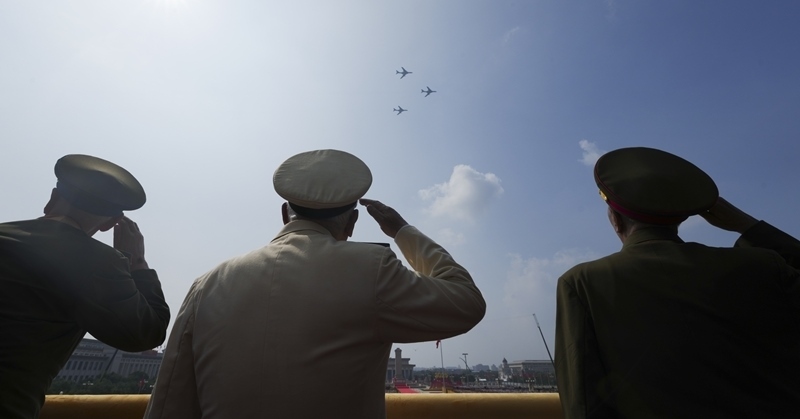 9月3日,紀(jì)念中國(guó)人民抗日戰(zhàn)爭(zhēng)暨世界反法西斯戰(zhàn)爭(zhēng)勝利80周年大會(huì)在北京隆重舉行。這是轟炸機(jī)梯隊(duì)飛過(guò)天安門廣場(chǎng)上空時(shí)嘉賓敬禮。