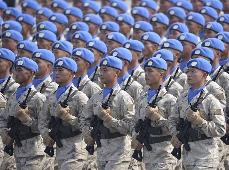 9月3日,紀(jì)念中國(guó)人民抗日戰(zhàn)爭(zhēng)暨世界反法西斯戰(zhàn)爭(zhēng)勝利80周年大會(huì)在北京隆重舉行。這是維和部隊(duì)方隊(duì)接受檢閱。
