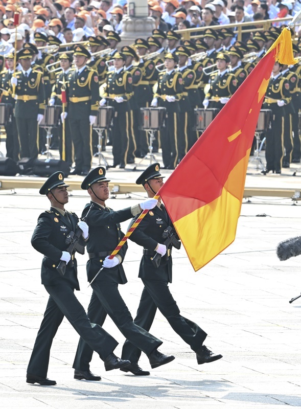 9月3日,紀(jì)念中國人民抗日戰(zhàn)爭暨世界反法西斯戰(zhàn)爭勝利80周年大會(huì)在北京隆重舉行。這是國旗護(hù)衛(wèi)隊(duì)在天安門廣場列隊(duì)。